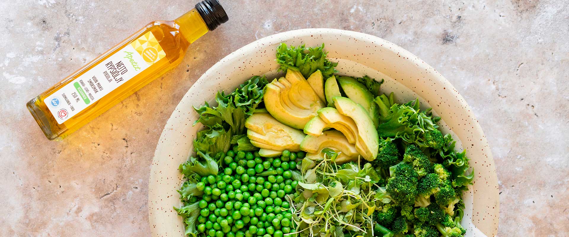 Apetitin Salaattiöljy yhdistää kotimaista rypsiöljyä ja espanjalaista ekstra-neitsyt oliviiöljyä