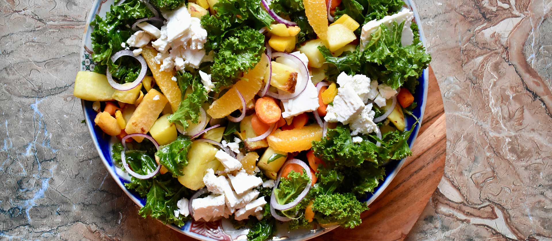 ”Juuresten lisäksi salaattiin tulee lehtikaalia, punasipulia, fetajuustoa ja appelsiinia. Salaatin voi syödä lämpimänä tai kylmänä. Oli kiva huomata, miten hyvin juurekset toimivat salaatissa”, Junker kertoo.
