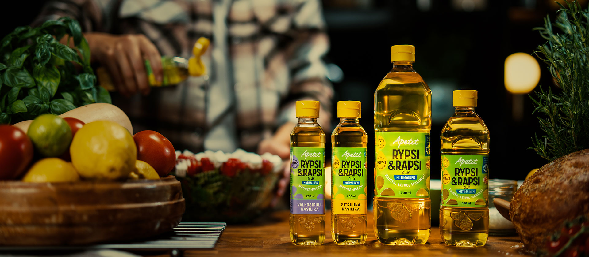- Vähittäiskaupassa myytyjen Apetit-öljyjen raaka-aine on 100-prosenttisesti kotimaista rypsiä ja rapsia siinä suhteessa, kuin öljykasveja on Suomessa viljelty.
